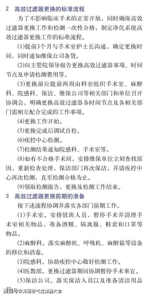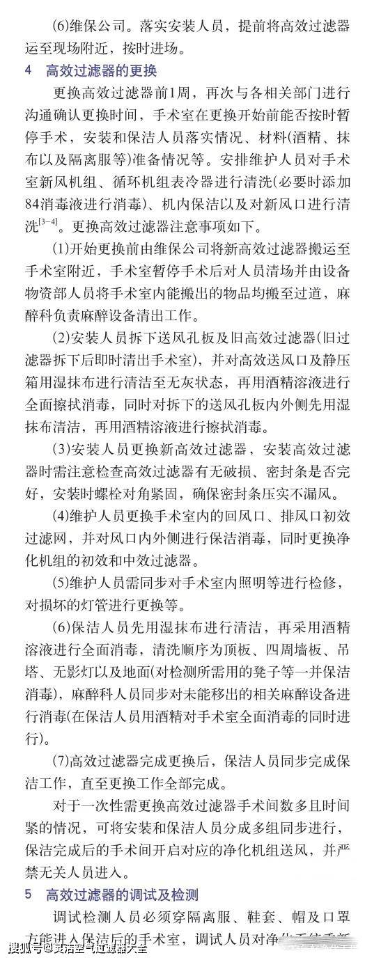 更換手術(shù)室凈化系統(tǒng)高效過(guò)濾器前1周,再次與各相關(guān)部門(mén)進(jìn)行溝通確認(rèn)更換時(shí)間,手術(shù)室在更換開(kāi)始前能否按時(shí)暫停手術(shù),安裝和保潔人員落實(shí)情況、材料(酒精、抹布以及隔離服等)準(zhǔn)備情況等。安排維護(hù)人員對(duì)手術(shù)室凈化系統(tǒng)的新風(fēng)機(jī)組、循環(huán)機(jī)組表冷器進(jìn)行清洗(必要時(shí)添加84消毒液進(jìn)行消毒)、機(jī)內(nèi)保潔以及對(duì)新風(fēng)口進(jìn)行清洗。下面由空氣好凈化工程技術(shù)團(tuán)隊(duì)建議更換手術(shù)室凈化系統(tǒng)高效過(guò)濾器注意事項(xiàng)如下。
