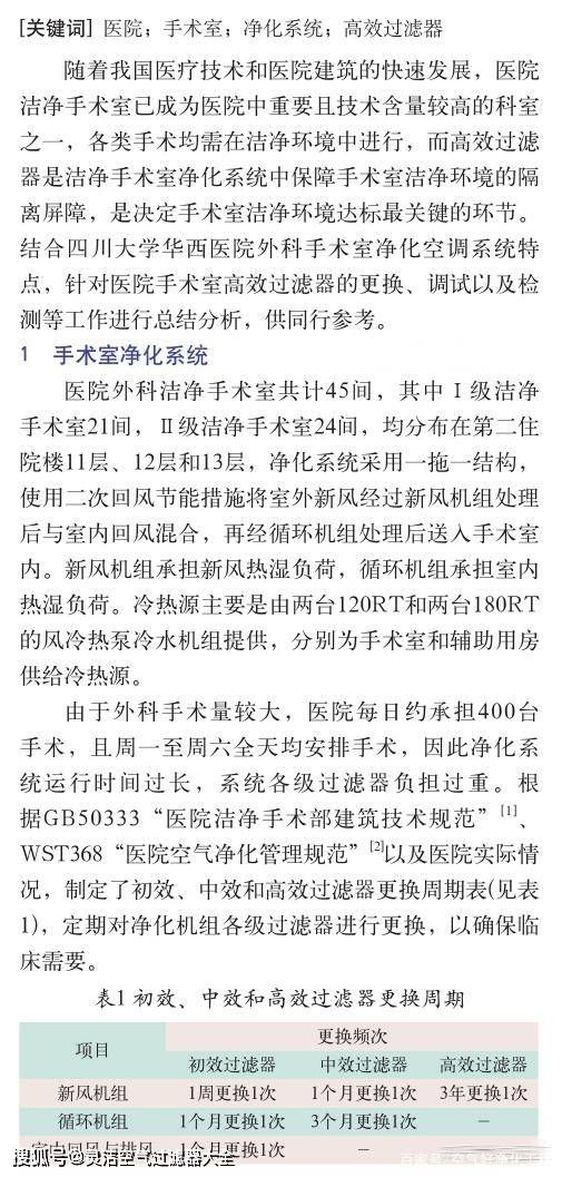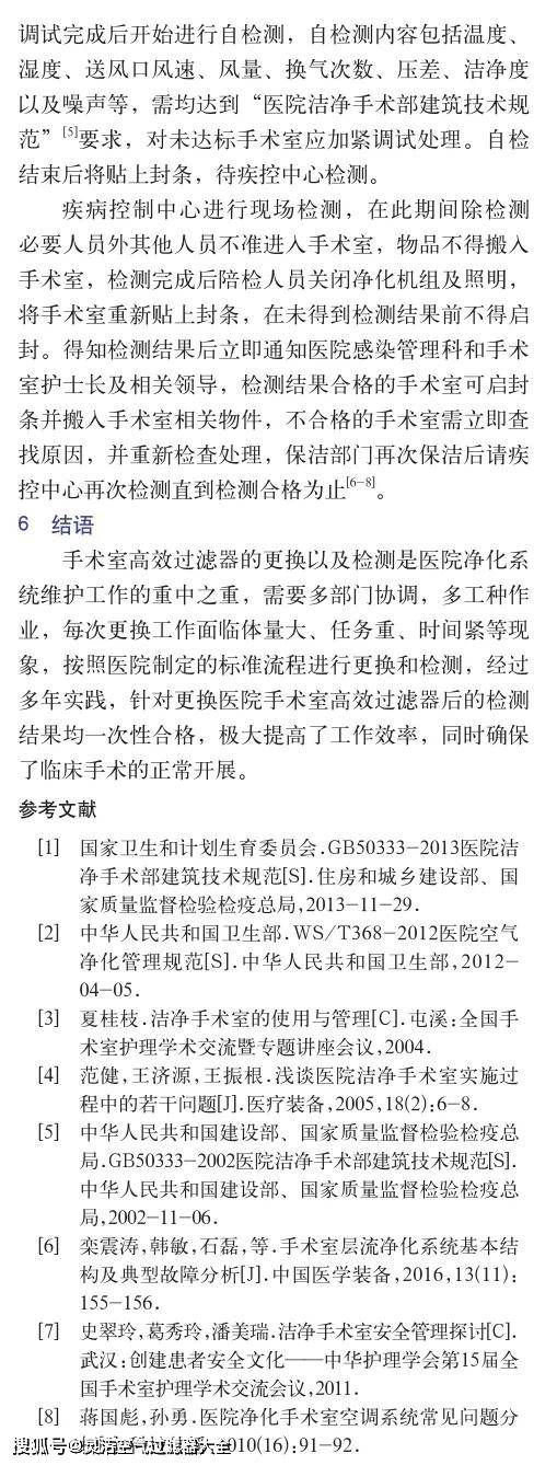 隨著我國(guó)醫(yī)療技術(shù)和醫(yī)院建筑的快速發(fā)展,醫(yī)院潔凈手術(shù)室已成為醫(yī)院中重要且技術(shù)含量較高的科室之一,各類手術(shù)均需在潔凈環(huán)境中進(jìn)行,而高效過(guò)濾器是潔凈手術(shù)室凈化系統(tǒng)中保障手術(shù)室潔凈環(huán)境的隔離屏障,是決定手術(shù)室潔凈環(huán)境達(dá)標(biāo)最關(guān)鍵的環(huán)節(jié)。